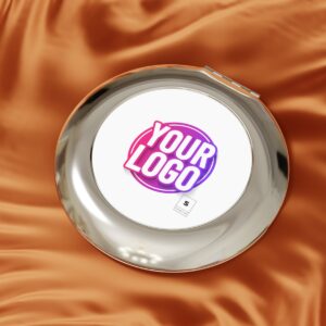 This personalized compact mirror is the perfect makeup gadget for touching up on the go. Made to be travel-friendly, cute, and shiny, it comes with a secure-snap friction closure, a sleek round shape and a metal finish for extra stylish points. Put your designs on the white metal insert and create the perfect travel makeup mirror.
